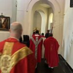 In het Palmpaasweekend nam kapelaan Geoffrey de Jong afscheid in twee vieringen. Zaterdag ging hij voor samen met pastoor Paul Janssen, pater Titus, pater Avin en pastoraal werker Johanneke Bosman in de Sint Cathrien. Het werd een feestelijke viering, waarin de beide betekenissen van 'passie', lijden en liefde, voelbaar waren. Na de zegening van de palmtakken buiten voor de kerk, liep de processie de hele kerk rond. Tijdens de door de Saint Catherine's Singers prachtig gezongen psalm 22 voelde je goed hoe de sfeer van opgetogenheid omsloeg in droefheid. Zo leefden we met Jezus mee. Kapelaan Geoffrey wist dit - zoals altijd - treffend te duiden, en ook hoe dit hem zelf raakte. Een groot aantal leden van de internationale gemeenschap was present. Mooi om te zien hoe zes van hen als misdienaar de viering begeleidden. Na afloop was er een gezellig samenzijn in de Pastorie, waarbij heerlijk gegeten werd. Tussendoor kwam frater Antonius van Erp, neef van frater Venantius Geoffrey nog toezingen. Dank ook aan alle vrijwilligers die dit samenzijn hebben voorbereid.