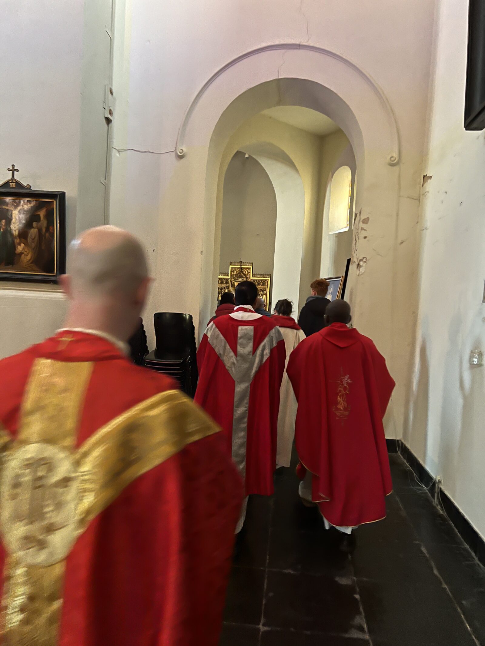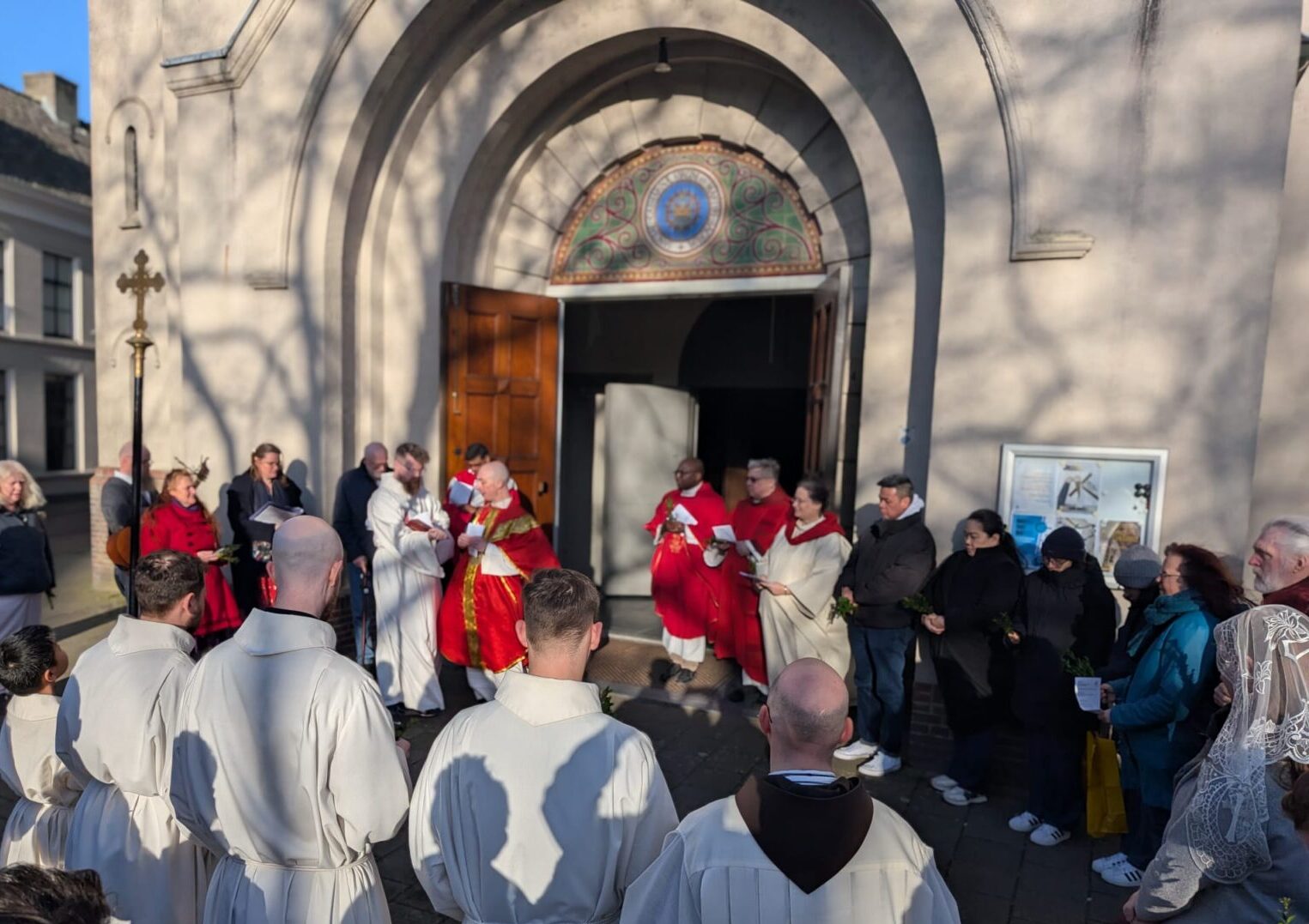 In het Palmpaasweekend nam kapelaan Geoffrey de Jong afscheid in twee vieringen. Zaterdag ging hij voor samen met pastoor Paul Janssen, pater Titus, pater Avin en pastoraal werker Johanneke Bosman in de Sint Cathrien. Het werd een feestelijke viering, waarin de beide betekenissen van 'passie', lijden en liefde, voelbaar waren. Na de zegening van de palmtakken buiten voor de kerk, liep de processie de hele kerk rond. Tijdens de door de Saint Catherine's Singers prachtig gezongen psalm 22 voelde je goed hoe de sfeer van opgetogenheid omsloeg in droefheid. Zo leefden we met Jezus mee. Kapelaan Geoffrey wist dit - zoals altijd - treffend te duiden, en ook hoe dit hem zelf raakte. Een groot aantal leden van de internationale gemeenschap was present. Mooi om te zien hoe zes van hen als misdienaar de viering begeleidden. Na afloop was er een gezellig samenzijn in de Pastorie, waarbij heerlijk gegeten werd. Tussendoor kwam frater Antonius van Erp, neef van frater Venantius Geoffrey nog toezingen. Dank ook aan alle vrijwilligers die dit samenzijn hebben voorbereid.
