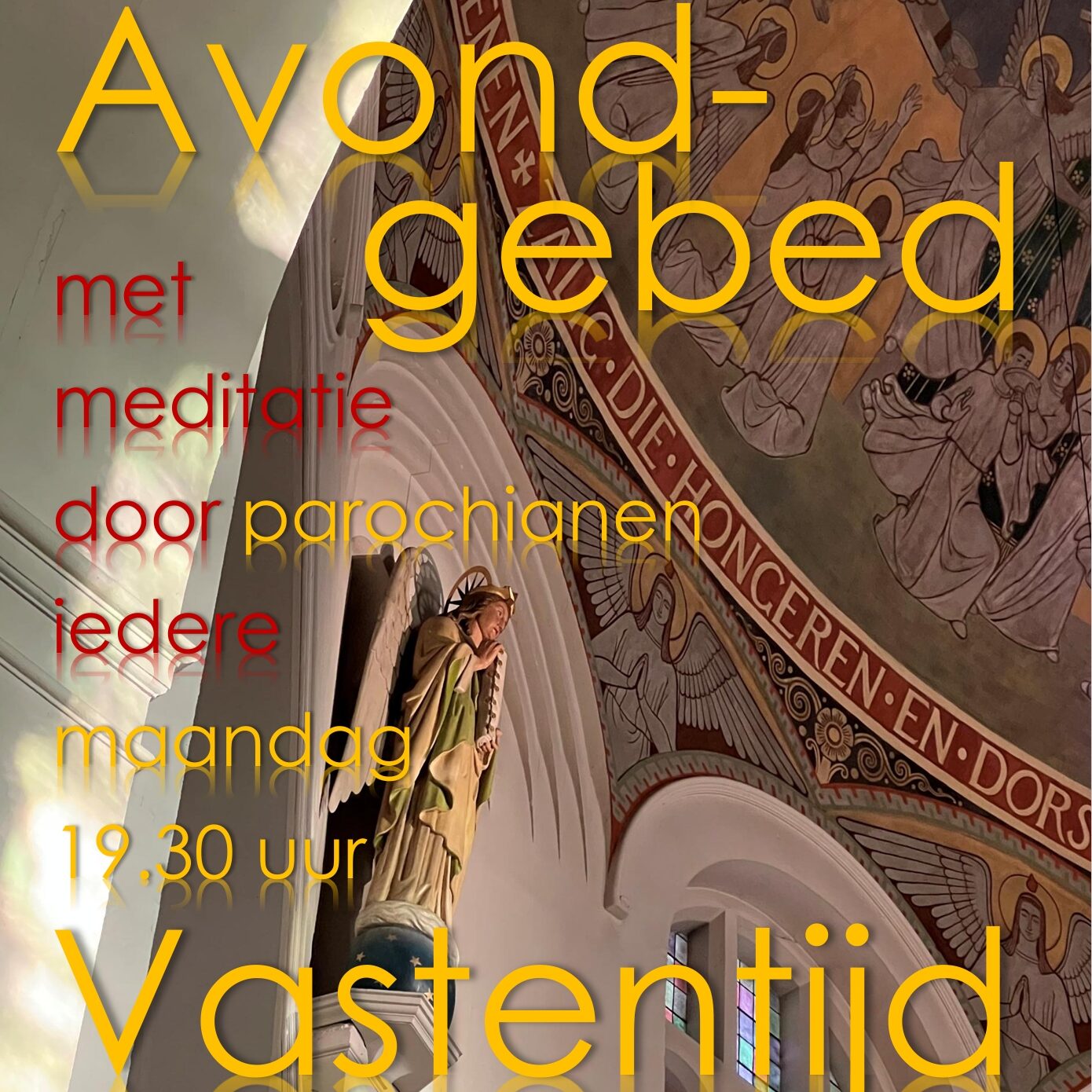 Every Monday in Lent, 19.30 PM in Sant Catherine's Church with meditation by one of our parishioners. If you want, you can join us for dinner at 18:00 PM (€ 2,=; please let us know: cathrien@parochiemaria.nl).