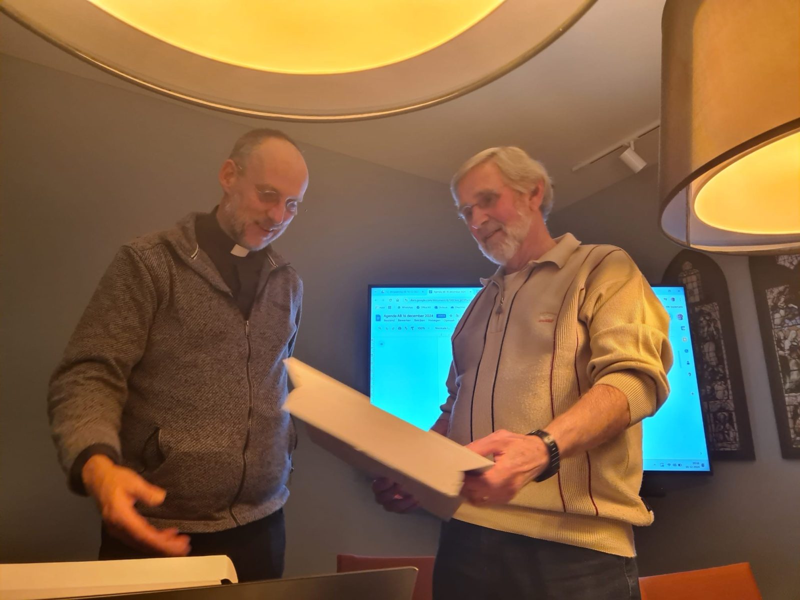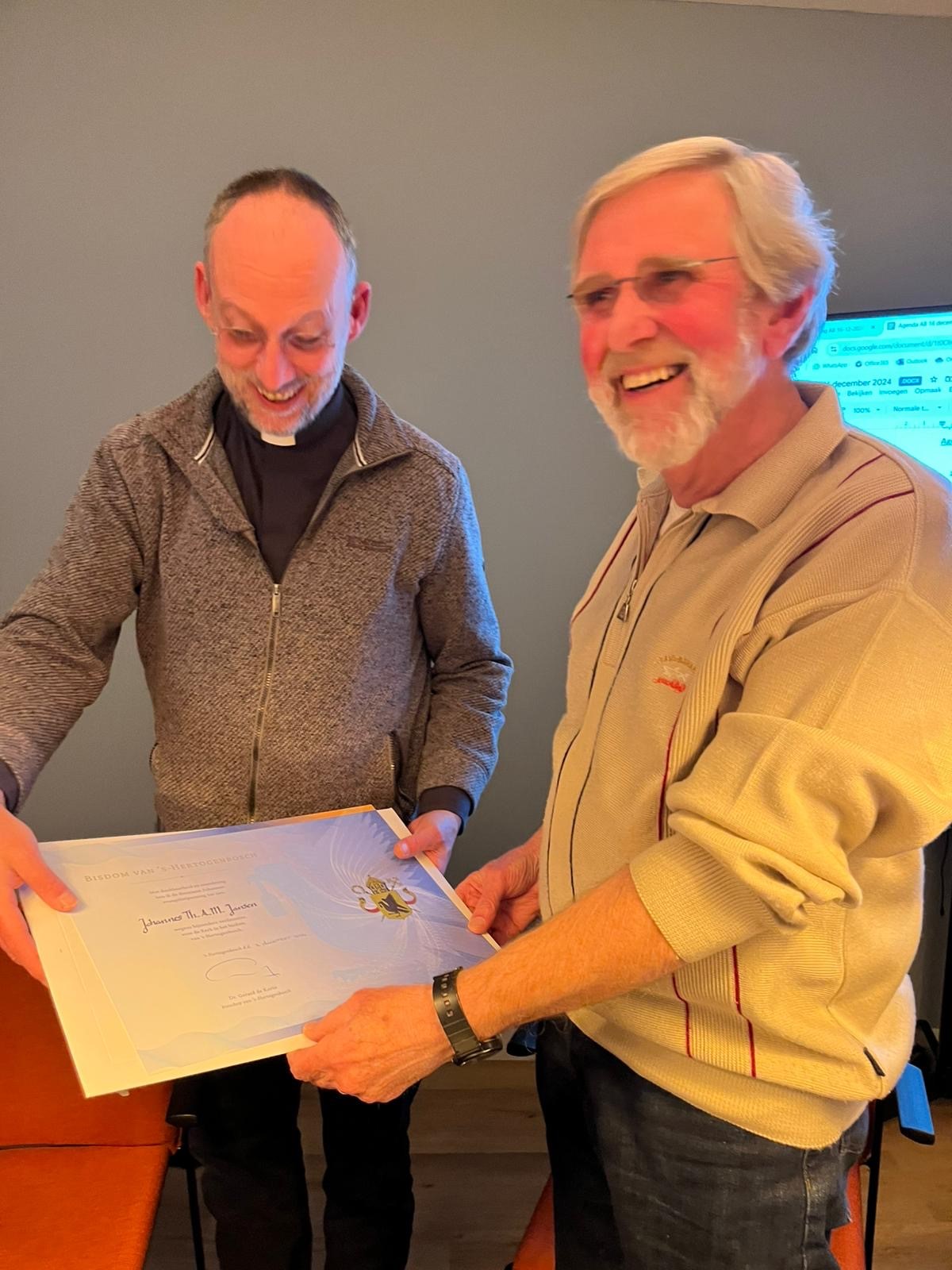 Tijdens zijn laatste vergadering als lid van het parochiebestuur H Maria kreeg Jan Jansen op maandag 16 december 2024 door vicaris generaal mgr Theo Lamers de Johannes-Evangelistpenning uitgereikt, een bisschoppelijke onderscheiding van waardering voor bijzondere verdiensten. Jan was 17 jaar lid van het parochiebestuur, telkens na verzoek vanuit het bestuur om beschikbaar te blijven. Jan was voorzitter van de commissie vastgoed en heeft in zijn bestuursperiode het sluiten en verkopen van veel kerkelijk vastgoed verzorgd. Naast het kerkbestuur was hij ook actief betrokken als bestuurslid bij veel andere organisaties zoals bijvoorbeeld de HEVO en het gezondheidscentrum in Rosmalen. In de afscheidsspeech werd hij geroemd om zijn verbindende kwaliteiten en gerichtheid op samenwerking. Jan werd een parel voor de samenleving genoemd en een diamant voor onze parochie H Maria. Als bestuurslid neemt Jan nu afscheid, maar hij blijft op de achtergrond betrokken bij de parochie Maria.